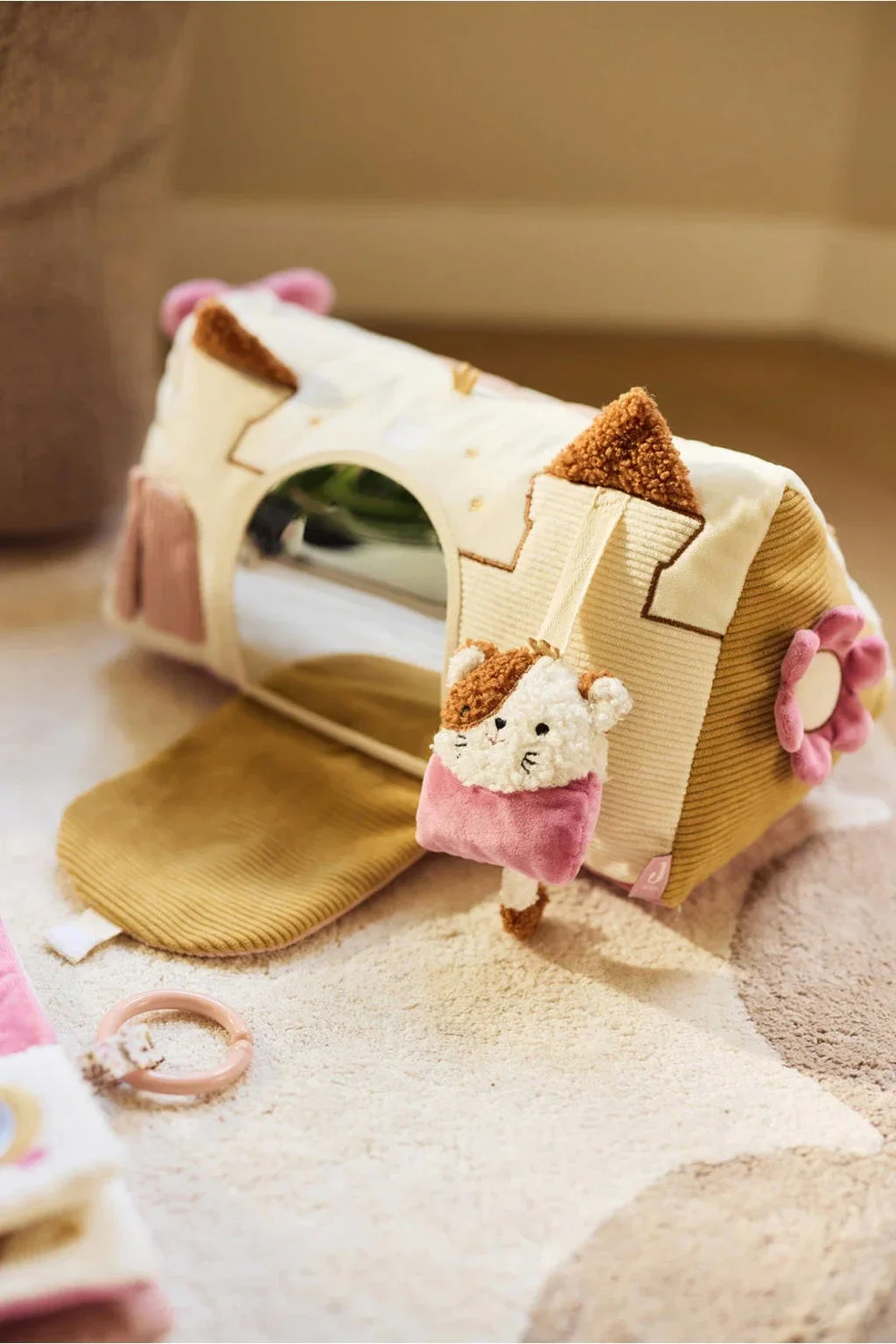 Deze activiteiten driehoek Flower Fairies is een magisch speeltje voor je kleintje. De driehoekige knuffel heeft een grote spiegel en deurtjes die je kunt openen. De driehoek heeft de vorm van een kasteel en is volledig van zachte ribstof. Op het kasteel is een geborduurde koets te zien. De driehoek is verder versierd met een fel roze bijtring en een zachte hart hanger. Aan de zijkanten zitten Flower Fairies printjes en knisperingen, tags, hangers en vakjes! Perfect voor uren speelplezier! Leg deze driehoek in de box of op het speelkleed en laat jouw mini heerlijk ontdekken!